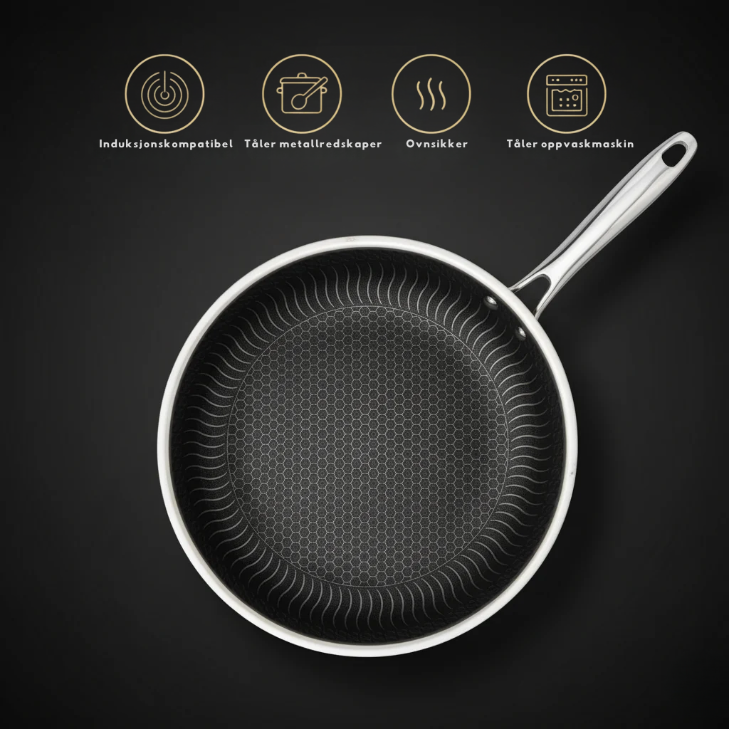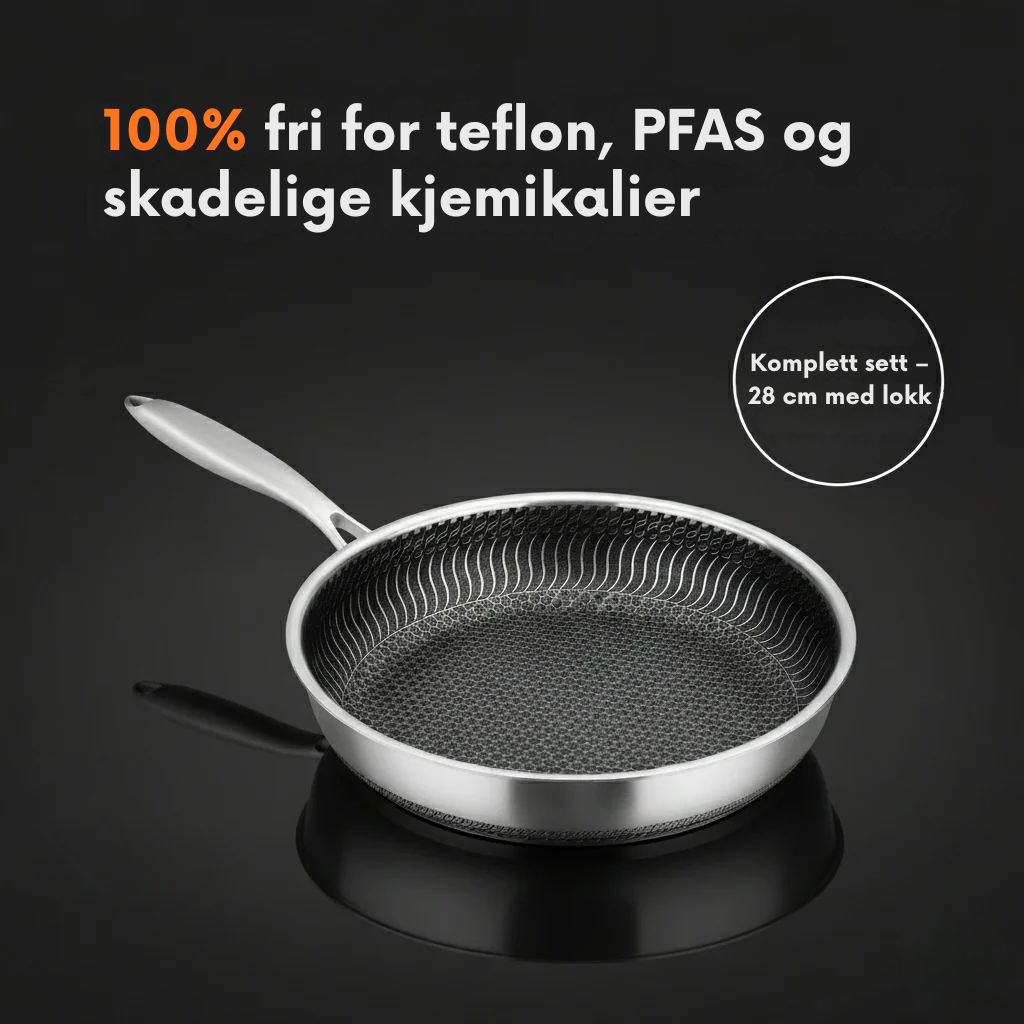Vanlige gryter i rustfritt stål kan være slitesterke, men maten setter seg lett fast. Havstein™ kombinerer robust stål med keramisk non-stick – en hybrid som gir deg både holdbarhet og enkel rengjøring.